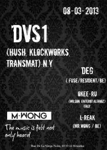 Date / Friday, 8 March 2013 Time / tbc Venue / Mr. Wong/ Rue de la Vierge Noire 10-12-14 ; Brussels 1000; Belgium Cost / 8-10 Line-up / DVS1 – (HUSH, KLOCKWORKS, TRANSMAT) DEG (FUSE/RESIDENT/BE) OKEE-RU (WILSON ENTERBT ALTAVOZ) L-REAK (MR. WONG/BE)