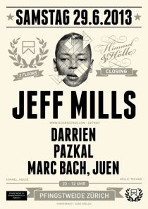 Date / Saturday, 29 June 2013 Time / 23:00 – 12:00 Venue / Pfingstweide/ Pfingstweidstrasse 12; 8005, Zürich; Switzerland Cost / CHF 32.00 Line-up / Jeff Mills, Pazkal, Darrien, Marc Bach, Juen Promotional links / event on facebook